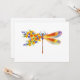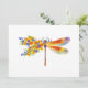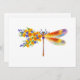 Artistiek beschilderde, bloemige libel in contrasterend sinaasappel en paarse met geel, fel, bloeiende Californische papaver en blauwe wilde bloemen op een witte achtergrond.