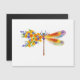Artistiek beschilderde, bloemige libel in contrasterend sinaasappel en paarse met geel, fel, bloeiende Californische papaver en blauwe wilde bloemen op een witte achtergrond.