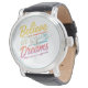 Een speels en bemoedigend ontwerp met de tekst "Believe in Your Dreams" in een kleurrijk, handgeschreven lettertype, dat de energie en drive vertegenwoordigt die nodig zijn om iemands doelen te bereiken.