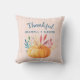Een vierkant kussen met een typografische tekst die zegt: Gelukkig dankbaar gezegend. perfect voor het seizoen van de Thanksgiving. Een afbeelding van een oranje waterverf pompoen met herfstbladeren en sprigs. Roze en goudstaven patroon voor de achtergrond.