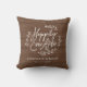 Gedrukte donkere houtsachtige trouwcadeaukussens met een strak ontwerp dat de woorden bevat die de hele tijd gelukkig zijn in een uniek script dat wordt omringd door eenvoudige laurelbladeren met namen en trouwdatums die u kunt personaliseren.