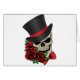 De herenschedel is gekleed in zijn fijnste bovenhoed en rode boeg stropdas met mooie rode rozen.
