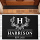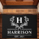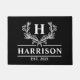 Welkom gasten met tijdloze elegantie met deze gepersonaliseerde zwarte deurmat. Het stijlvolle monogram, familienaam, en gevestigde jaar, allemaal weergegeven in een helder wit lettertype, creëer een gastvrije en gepersonaliseerde ingang. Deze deurmat is vervaardigd uit duurzame materialen en is perfect om een vleugje verfijning toe te voegen aan uw veranda of patio.