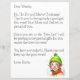 Voeg de naam van uw kind toe aan deze persoonlijke brief van de Kerstman. Schattigee stijl elf glimlachen. Terug heeft een Noordpool bord met verlichte kerstverlichting en een besneeuwde achtergrond met een stempel van Santa en The North Pole.