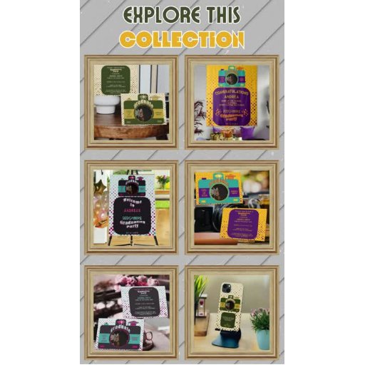Afstuderen Of het nu gaat om een familielid, een goede vriend van je of je speciale iemand die houdt van kunst en fotografie, de perfecte manier om deze persoon te behandelen is door hem of haar een unieke en trendy gepersonaliseerde telefoonhoes te geven. Deze retro-geïnspireerde en nostalgische boho-stijl van het ontwerp met het gebruik van camerakunst, retro-teksten en kleurenschema's van groen, geel en beige belichten artistiek zijn visuele functie in de speelse polka-stippen achtergrond, waardoor deze telefoonhoes creatiever en aantrekkelijker wordt. Dit ideale schattige geschenk zal zeker maken dat de celebrant zich speciaal voelt omdat je een portretfoto van hem of haar en een motivatie quote kunt toevoegen, zodat de celebrant persoonlijk kan genieten van het gebruik van dit als een herinnering aan zijn of haar harde werk en toewijding naar het bereiken van deze mijlpaal van de reis van de afgestudeerde naar succes.