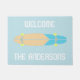 Welkom gasten in stijl met deze gepersonaliseerde deurmat met een illustratie van een longboard skateboard in een retro stijl. Het geelbruine, helderblauwe en heldergele skateboard is geplaatst tegen een lichtblauwe achtergrond met een welkomstboodschap en jouw naam in vetgedrukte witte letters.