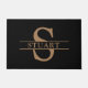 Deze moderne en klassieke zwarte gepersonaliseerde welkomstmat is voorzien van uw monogram initiaal en uw familienaam in lichtbruine klassieke typografie op een zwarte achtergrond.