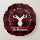 Het productontwerp bevat een silhouet van een hert op een klassiek rood en zwart buffelvlakpatroon. Samen met uw eigen gepersonaliseerde tekst maakt deze samenstelling een boerderijstijl, modern, uniek rond kussen voor gezinshereniging, kerstvakantie, of andere speciale gelegenheden!