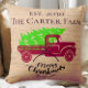 Dit rustieke kerstbomenkussen in stijl is gepersonaliseerd met uw familienaam en jaar - met een rode vrachtwagen, groene kerstboom en een ornament met 'Vrolijk kerstfeest'. Het perfecte cadeau voor pasgetrouwden. Pas het aan met het jaar dat je bent opgericht!