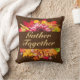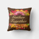 De Herfst/Thanksgiving met de thema's werpen kussen kenmerkt een Autumn waterverf geïllustreerd spleet van bladeren met gecentreerde "Gather Together" aanpasbare tekst op donkerbruine achtergrond.