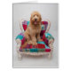 Een gelukkige Goldendoedel zit op een kleurrijke, gevlekte stoel. Deze schattige shaggy puppy lijkt groter dan de stoel maar nooit te groot om je armen te houden. Met zijn tong eruit, die de camera in deze foto onder ogen ziet, maakte hij de perfecte metgezel. Ontdek hier veel meer schattige puppies op Zazzle met Getty Afbeeldingen.