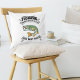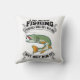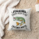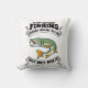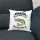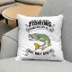 Dit afbeelding is voorzien van een vierkant decoratief kussen met een humoristische vissen-thema print. De centrale afbeelding is een levendig gekleurde illustratie van een vis, mogelijk een bas, met zijn mond open, alsof hij halverwege de sprong werd gevangen. De vis is omgeven door een lintachtig spandoek dat een geestige uitspraak bevat die in twee delen is verdeeld: de bovenste boog luidt "EEN DAG ZONDER GEVIST" en de onderste boog eindigt met "MAAR WAAROM RISKEREN WE IT". Tussen de bogen door, de punchline "WAARSCHIJNLIJK ZOU IK NIET DODEN" overbrugt de boodschap. Het ontwerp maakt gebruik van een klassieke combinatie van lettertypen die een gevoel oproepen, en de kleuren zijn aards met een vleugje realisme in de afbeelding van de vis.
