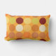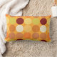 Lumbarkussen in een Mid-Century Moderne geometrische afdruk van reuzenstippen, in een raster van negen coördinerende kleuren - schaduwen van licht tot donker mosterdgoud, mahogany brown, tan en oranje, op een diepe mosterdgoud/saffraanachtergrond