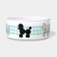 hondengerecht gemaakt met een lichte turquoise en witte gingham band, rond het schaaltje, en afbeeldingen van turquoise, zwarte en witte fluffy poodles rond het schaaltje. Het aanpassen staat u toe om tekst toe te voegen, voor een gepersonaliseerde kom uw hond kan trots zijn op. Het maakt een geweldig cadeauidee.