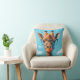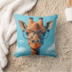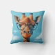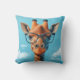 Een giraffe draagt een stijlvolle bril met zwarte rand tegen een zachte blauwe achtergrond, waardoor het een expressieve en grillige uitstraling heeft