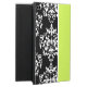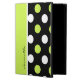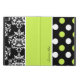 iPad Air 2-hoesje, met ingebouwde standaard en graphics van drie strepen van verschillende patronen. Een zwart-wit demaspatroon, een stevig chartreuse, en een zwart met witte en chartreuse polka punten. Pas de zwarte tekst aan uw behoeften aan. Het maakt een uitstekend cadeauidee.
