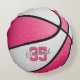 Dit gepersonaliseerde meisjes basketbalkussen beschikt over het realistische afbeelding van een basketbal die afwisselend roze en wit herkleurde panelen heeft - personaliseer met de naam van de speler in een lettertype in "autograph"-stijl dat boven het jersey-nummer van de atleet ligt - van katz_d_zynes