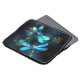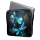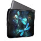 Twee doorzichtige, lichtgevende, turquoise, artistiek getekende libellen op een nachtblauwe achtergrond met lichtgevende algen en vuurvliegjes in het meer. Lichtgevende libel.
