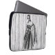 Dit is een stijlvolle zwart-wit mode met een geposte vrouw in een dramatische, off-the-shoulder jurk met ingewikkelde bloemenversieringen en een vloeiende, pure cape. De achtergrond heeft een opvallende verticale lijnstructuur, waardoor een gevoel van diepte en beweging wordt toegevoegd