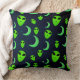 Groene gloeiende buitenaardse wezens koppen en halve manen en sterren tegen een blauwe sterrenhemel.