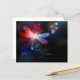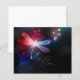 Gloeiende, vliegende, rode libel, met transparante, gedetailleerde vleugels op een donkere, nachtelijke, lichtgevende achtergrond met tropische planten en vuurvliegjes. Rode libel.