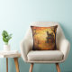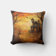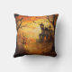 Schilderachtig Halloween gooikussens zijn voorzien van een AI-gegenereerde afbeelding van een spookachtig herenhuis met gloeiende oranje lucht, vleermuizen en enge dode bomen.