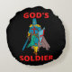 Dit ronde kussen heeft de woorden God's Soldier in een vet lettertype plus rode letters met een soldaat in volledige harnas met een zwaard plus schild in het midden met een op geloof gebaseerde thema. Dit kussen is gemaakt van hoge kwaliteit stof onze kussens zijn zacht en rimpelvrij de hoes is wasbaar in de machine.