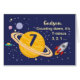 Zeven draaien is uit deze wereld, vooral als het je godson is! Het raketschip, de planeten en de sterren vullen de voorkant van de kaart met het bericht in aangezien u neer tellen om Happy Birthday te zeggen!