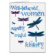 De humoristische feministische slogan "Goed gedragen vrouwen maken zelden geschiedenis" gaat vergezeld van libellen in tinten blauw en paars op een breed scala aan producten. Zoek t-shirts, kantoorbenodigdheden en huishoudelijke artikelen met dit kleurrijke design.
