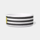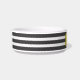 Bone Appetite! De Gold Bone Pet Bowl heeft klassieke onyx zwarte en witte strepen en in het midden een metalen goudbot. Deze mooie keramische kom bestaat uit twee maten en heeft veel verschillende trendy gekleurde strepen om uit te kiezen in mijn winkel. De gouden metalen details worden gesimuleerd in de illustratie.
