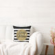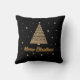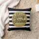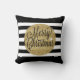 Kerstkussen om deze speciale dag te vieren, Dit zwart-wit gestreepte kussen heeft een gouden wijzerplaat met de woorden "Vrolijk kerstfeest." En achterin een gouden kerstboom met ronddraaiende sterren.