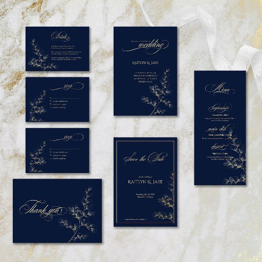 A wedding menu in gold and navy with botanical elements
