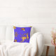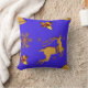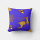 Een feestelijke kerstkussen met een gouden rendier, gouden heilig met rode robijnen voor bessen, gouden sneeuwvlokken en sterren tegen een feestelijke, traditionele kerstblauwe achtergrond om een kleurrijke en feestelijke blik toe te voegen aan uw kerstvakantiehuisdecor.