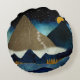 Een abstract landschap met unieke kleuren en texturen die een nachtelijke bergscène tonen met de gloeiende lichten van klimmers en een maan in tinten blauw, goud, cyaan en geel.