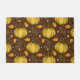Een feestelijk patroon van gouden pompoenen, oranje bladeren en harten, en herfsten bessen op een bruine achtergrond.