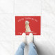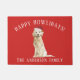Schattige kerstdeurmat met een Golden Retriever Dog met een kerstmuts op een feestelijke rode achtergrond.