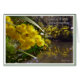 Closeup Golden Wattle tak zwaar met gele bloemen. De waterslagen over een rivier reflecteren prachtig in het water. Een prachtige kaart - je kan de bloemen bijna ruiken.