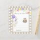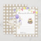 GEKKE GANS. Waterverf kinderen verjaardagsfeestje. Waterverf schattige gans in verjaardagstaart, pet met bessen, paarse ballon, feestelijke vlaggenslinger. Beige-bruine kooi achtergrond.