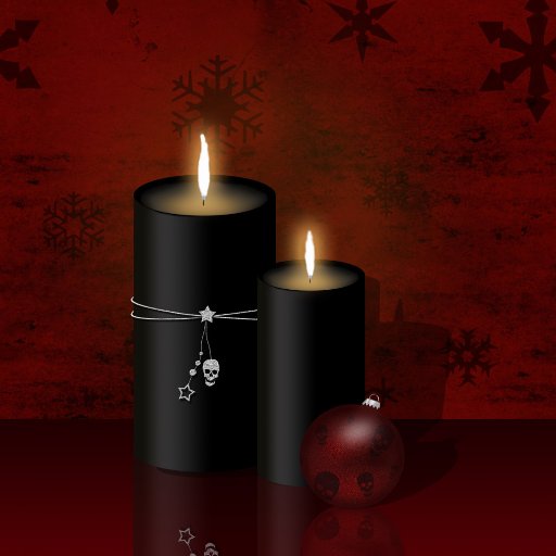 Gothische kersttekening met zwarte kaarsen met een zilveren schedel en een rode kerst met zwarte schedels op een grijze rood-zwarte achtergrond met sneeuwvlokken.