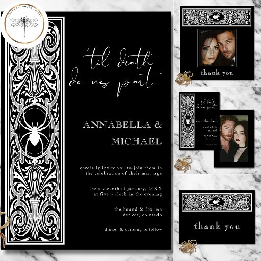 Vier je eeuwige liefde met een bruiloft en sla de datumkaart op met je favoriete foto die net zo vet en onvergetelijk is als je band. Met een opvallende zwarte achtergrond, een gotische witte rand en een delicaat spinnenmotief zet dit ontwerp de toon voor een nacht vol romance en mysterie. Het opvallende witte lettertype verklaart: "Tot de dood ons scheidt", en legt de essentie van je eeuwige gelofte vast. Perfect voor koppels die de schoonheid van het donker en de diepte van ware toewijding durven te omarmen. Creëer door Simply Farmhouse Press.