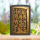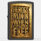 Gedurfde, gouden letters tegen een vurige achtergrond verklaren: Heroes Run In When Others Flee. Motivatie citaat over moed en moed.