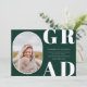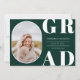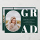 Cadre photo avant arrondi, faire-part/invitation de remise de diplômes de classe supérieure. Arrière - plan de couleur vert foncé, blanc en gras type "GRAD" et lignes de modèle texte pour le nom du diplômé, la classe de l'année et l'école. Le dos de la carte comporte deux espaces photo et des lignes de texte supplémentaires pour des informations sur la fête ou d'autres informations sur le diplômé.