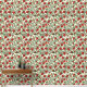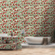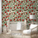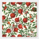 Granaatappel takken met weelderige bladeren en rijke rode vruchten strekken zich uit over een zwarte achtergrond. Een secundaire laag vervaagt subtiel en voegt diepte toe. Traditioneel geschilderd op papier met markeringen, worden de elementen gescand en gecomponeerd in een patroon in Photoshop.