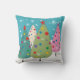 Grappige kerstbomen kussen, kunstzinnige hand getekende kerstbomen en sneeuw scene. Voor het kussen staan 4 grillige bomen in blauwgroen, groen, roze en crème op sneeuwbergen met een blauw besneeuwde achtergrond. Achterkant van kussen is een eenzame groene boom in coördinerende kleuren. De voorkant van de achterkant van het kussen is digitaal gesigneerd door kunstenaar: g.gabel. *Alle afbeeldingen door Gail Gabel, kunstenaar.