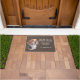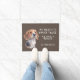 "We hoeven niet twee keer te kloppen, we hebben een Beagle" verklaart deze schattige deurmat. De tekst is in het wit aan de rechterkant, terwijl een schattig afbeelding van een bruine, zwarte en witte beagle aan de linkerkant staat. Alles is geplaatst op een grijsbruine achtergrond.