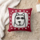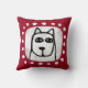 Een schattige getekende hond in zwart-wit over een rode getextureerde achtergrond omringd door witte stippen.