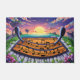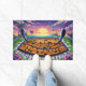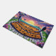 Een muzikale deurmat met noten zit voor een schilderachtig landschap met eilandjes en zonsondergang, geflankeerd door twee grote blauwe hoorns die naar de horizon reiken. Welkom uw dierbaren in stijl met deze - Amusante kleurrijke muzieknoten Design For Your Feet Before Enter Deurmat.