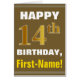 Ce simple design de carte de voeux sur le thème de l'anniversaire présente un voeu d'anniversaire chaleureux comme "HAPPY 14th BIRTHDAY, First-Name!" sur le devant, en texte gras sur un arrière - plan de couleur marron. Le numéro d'anniversaire a un look de couleur imitation or. Le nom sur le devant peut être customisé. L'intérieur comporte un message d'anniversaire qui peut être personnalisé. Une carte de voeux comme celle-ci pourrait être une façon amusante d'offrir des voeux d'anniversaire à quelqu'un qui célèbre son quatorzième anniversaire. [~Z0000281]