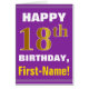 Ce simple design de carte de voeux sur le thème de l'anniversaire présente un voeu d'anniversaire chaleureux comme "HAPPY 18th BIRTHDAY, First-Name!" sur le devant, en texte gras sur un arrière - plan de couleur violette. Le numéro d'anniversaire a un look de couleur imitation or. Le nom sur le devant peut être customisé. L'intérieur comporte un message d'anniversaire qui peut être personnalisé. Une carte de voeux comme celle-ci pourrait être une façon amusante d'offrir des voeux d'anniversaire à quelqu'un qui célèbre son dix-huitième anniversaire. [~Z0000277]