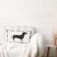Dachshund hondenkussen met de woorden "Dachshunds Welcome" in zwart script boven wit. De randen van de kussen hebben een grijs en wit gestreept ontwerp.